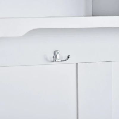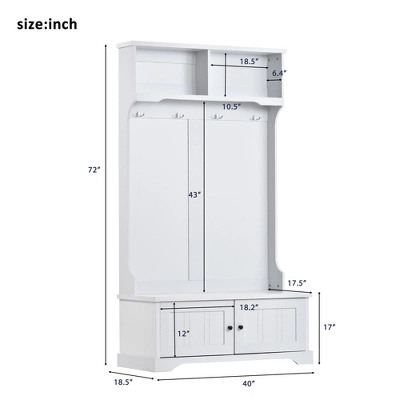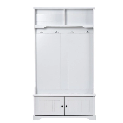 - Spacious Storage Space. With two open shelves at the top and a cabinet with a door at the bottom, a large space is available for storing daily necessities and small ornaments. Four hooks offer spacious space for hanging hats, coats, scarves, and other accessories.