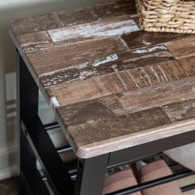 Keep your footwear organized with the Urban Escape Entryway Bench and Shoe Rack. This space-saving solution doubles as a seating area; a great addition to entryways, hallways, bathrooms and mudrooms. The look of distressed wood laminate adds a touch of rustic flair. Two black iron shelves at the bottom offer a spacious home for your footwear, or amp up the aesthetic by using it as a display area for books, plants, vases, memorabilia, or tabletop decor.