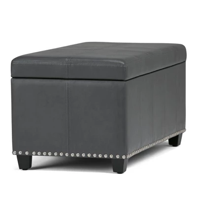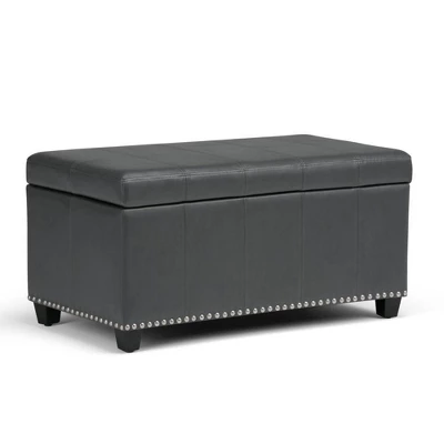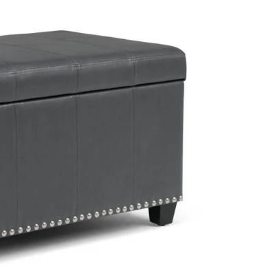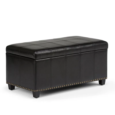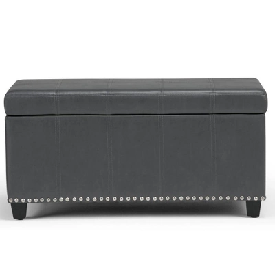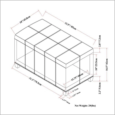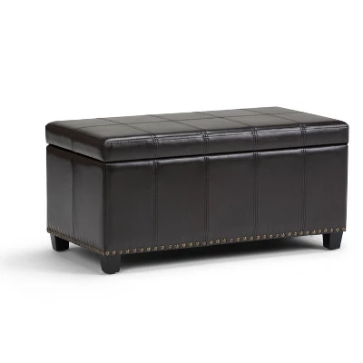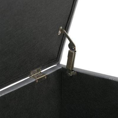 Megan 34 inch Wide Traditional Storage Ottoman. Comes with child safety hinge to prevent lid slamming. Stitched detail and nailhead trim at the bottom. Chocolate Brown PU Faux Leather. Available in Tanners Brown, Chocolate Brown, Midnight Black, Satin Cream, Crimson Red Faux Leather and Stone gray, Slate gray, Dove gray, Fawn Brown Linen Look Fabric. Simple assembly; just attach legs. Efforts are made to reproduce accurate colors, variations in color may occur due to computer monitor and photography. The product is warranted to be free from defects in material and workmanship to the original owner for the life of the product (conditions apply).
