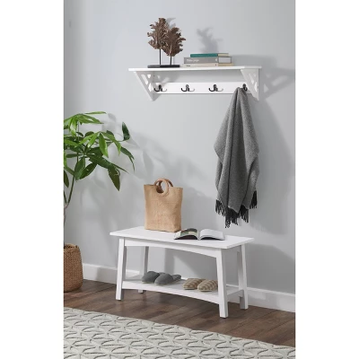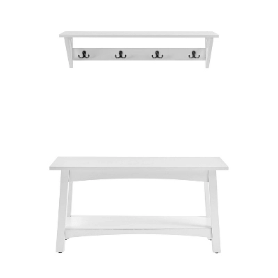 The 36″ Middlebury Coat Hook with Bench Hall Tree Set in White from Alaterre Furniture is a great addition to your living space. The crisp white finish will freshen up your home. The 4 double hooks are sturdy for heavy coats and bags and features a shelf for storage or decorative touches. The lower shelf of the bench offers a great place to keep shoes neat and tidy. Great for entryways, mudrooms, laundry rooms or extra seating at the dining table.