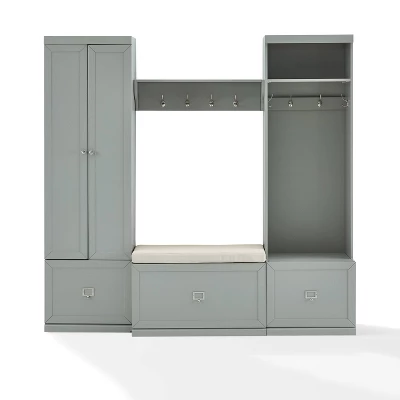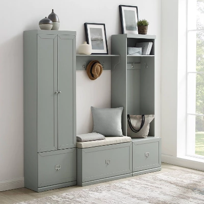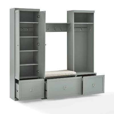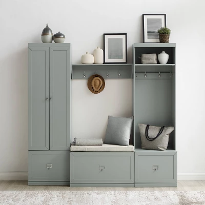 The Harper 4pc Entryway Set offers a great combination of storage solutions for your foyer or mudroom. The pantry closet provides adjustable and removable shelves, plus a full-extension drawer in the base. Without the shelves, the pantry closet offers hanging storage when you install the optional hooks. The hall tree also provides hooks for coats and hats and another full-extension drawer. An entryway bench with a cushioned seat and a wall-mounted shelf sits at the center of the set. Featuring label holder hardware, each storage drawer can be customized with personal labels. Every component of the Harper 4Pc Entryway Set is modular, allowing for flexibility and the look of genuine built-in storage.