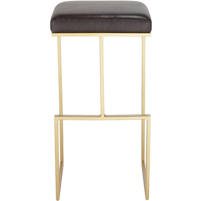 This modern bar stool offers eye catching luxe style for your decor. The open frame design features minimal lines and a sturdy metal construction. A crossbar joins the two legs and functions as a foot rest. The gold finish frame offsets nicely with the faux Brown leather seat, which has stitched detailing. Non-adjustable bar height stool.