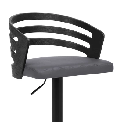 The Armen Living Adele Adjustable Height Swivel Gray Faux Leather and Black Wood Bar Stool with Black Base is the perfect addition to your home. The adjustable seat height functionality allows you to use this kitchen stool at your home bar, kitchen island, or peninsula without having to worry about the surface height. The convenient swivel function optimizes everyday use or entertaining, keeping everyone engaged regardless of their place in the room. The plush padded seat with high-density foam will provide you with all-day comfort. The curved wood back is ideal for posture alignment and an unmatched support for days on end. The foundation of the product is supported by wood and features a metal footrest for a chic and stylish aesthetic without comprising practicality and functionality of this item. The mid-century silhouette exudes timeless beauty that will last for many years to come. The Adele is available in multiple color options, featuring a walnut wood back with your choice of black, cream, or Gray faux leather upholstery with a Chrome base or a black wood finish with your choice of Gray faux leather and a black base or Gray faux leather and a chrome base.