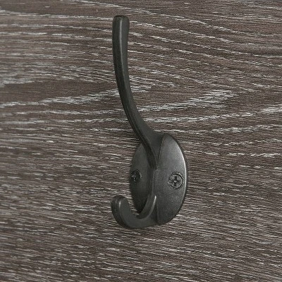 Modern hall tree features weathered woodgrain and black metal frames for a simple, stylish way to tidy up your entryway. Includes two shoe racks, one bench seat, 3 double coat hooks and one open top shelf. Narrow design perfect for maximizing storage in smaller entryways and mudrooms. Add simplistic style to your entryway with all four Afton Collection items.