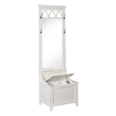 The Alina Hall Tree beautifully mixes style with function and is an easy storage solution for small spaces. The multi-functional 48″ hall tree has bead board detailing on the lower back, front and sides for added look. Four hooks and a mirror inlay panel offer convenience. The lift top bench has a deep storage space as well as child safe hinges and breath holes for safety. Easy to assemble and maintain, spot or wipe clean when needed.