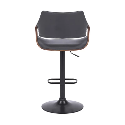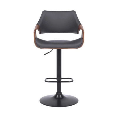 The Armen Living Aspen Adjustable Swivel Faux Leather and Walnut Wood Bar Stool is an ideal addition to any home. The adjustable seat height functionality allows you to use this stool at your kitchen island, home bar, or peninsula without having to worry about the surface height. The convenient swivel function optimizes everyday use or entertaining, keeping everyone engaged regardless of their place in the room. The plush padded and high-density foam seat and back rest atop a strong pedestal base that creates a sturdy and comfortable seating experience. Wrapped in luxurious faux leather upholstery and complimented by beautiful walnut wood accents, the Aspen stool has a mid-century silhouette exudes timeless beauty that will last for many years to come. The Aspen Adjustable Swivel Faux Leather and Walnut Wood Bar Stool is available in black, Gray, or cream upholstery with walnut wood accents and a black or chrome metal base.