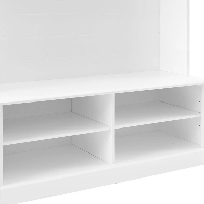 With the popular look of modern farmhouse shiplap, the Bartlett Hall Tree is an on-trend take on home organization. Featuring a bench seat with shoe storage beneath, this hall tree is an ideal spot to slip off your shoes at the end of the day. Three extra-large, double-prong hooks look right at home under the arched top and stationary shelf. Topped with classic crown molding and backed with horizontal planking, the Bartlett Hall Tree offers beautiful storage for every entryway.