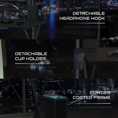 Saving Progress. Welcome to the Division X gaming desk experience. Commanding features include the detachable cupholder and headphone hook which allow you to keep your streak without leaving your seat. Boosted by a powder coated x-shaped frame with screw leveling floor glides. The smartphone/monitor stand is also detachable allowing you to house dual PC monitors. Laminate surface top includes a cable management grommet to complete the kit. Additional Features: Cable Management Grommet, Self Leveling Floor Glides