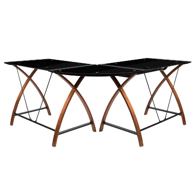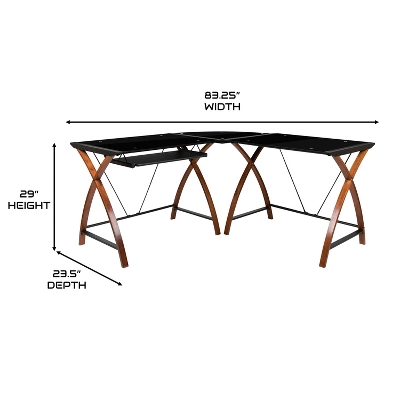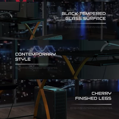 Downloading Data Package: A new dawn is here with the Dusk To Destiny gaming desk outfitted with all the post-modern features. Cool as black ice with a 5mm tempered glass surface and a powder coated brace frame. The 83.25” overall diagonal width is a perfect corner shape design or stands to impress out in the open. The well-rounded 33.75” wide connector piece provides tactical correspondence between the two primary 39.25” wide desks. Bonus content includes a stealthy sliding keyboard tray. Additional Features: Covert Sliding Keyboard Tray, Self Leveling Floor Glides
