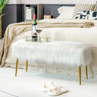 Our ottoman bench gives your interior a visual complement by impressing you with its warm furry faux fur and delicate golden legs. The golden color is electroplated on to protect the steel legs from rust and corrosion. The stable legs with anti-scratch footpads ensure excellent stability. Note: the legs are placed in the pocket under the seat base. The seat base is filled with a high-density sponge for comfortable support. It is the perfect accent for living rooms, bedrooms, vanity chairs, shoe benches, extra seating, and more! Coming with detailed instructions and a simple structure, you can soon enjoy this vanity bench.