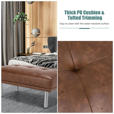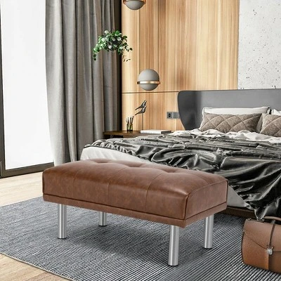 If you are looking for a mid-century luxurious bench for your home, look no further. This upholstered bench is used individually as a resting bench on your porch and hallway, or it can correspond with your sofa to form a comfortable recliner. Or you can place it at the end of your bed. Stainless steel and solid wood materials showcase durability while the overstuffed PU cushion reveals comfort. The bench is stable and cozy once assembled with simple steps. It is lightweight, yet can hold a maximum load capacity of 265 lbs. Benefitted from its classic appearance, this bench is a versatile match for most of the home.