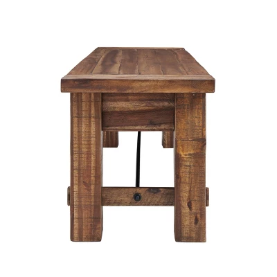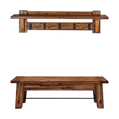 Alaterre Furniture’s Durango Industrial Wood Coat Hook Shelf and Bench Set is truly a sight to behold! At 60″ long we see it used as an awesome entryway bench where everyone can line up to get their winter boots and snowshoes on! And when you come back inside you can hang your coats and scarves on the coordinating coat hook. This set is part of a collection of bold, industrial accent pieces that will make a statement in your living space. With the bench’s truss-style construction, bolts and metal rod accents you will love how these pieces take your decor to a new level. Knots, cracks and even rough-hewn edges showcase the wood’s original qualities. Our lacquer finish with light and dark tones allows for the wood’s natural grain to show through. No piece is exactly alike; subtle imperfections such as knots and cracks are part of the wood’s character. These pieces will allow your décor to be uniquely yours; each piece alone makes a statement. Together this set creates a distinct rustic industrial style.
