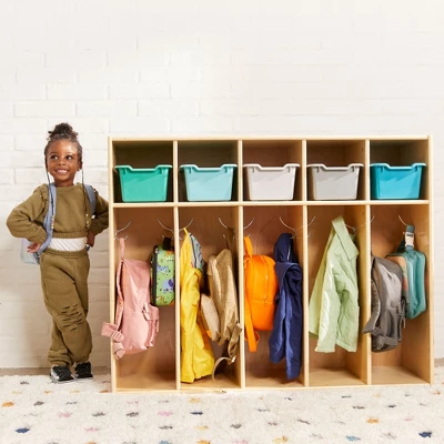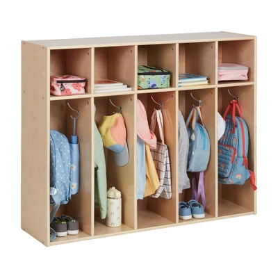 Maximize space and keep your room organized and clutter-free with the ECR4Kids Streamline 5-Section Toddler Coat Locker. The wooden locker features five long compartments with ten double coat hangers for sweaters, toddler backpacks, and umbrellas. Give children their separate cubby storage to keep art projects, homework, and personal belongings organized. Pair with ECR4Kids Scoop Front Storage Bins to keep little things contained and off the floor; bins are sold separately. Use in a children’s bedroom to organize dress-up clothes, costumes, accessories, hats, gloves, and more. The low-profile open-face shelves encourage children to care for their belongings and clean up independently. The drop-and-go storage is constructed from sustainably harvested birch plywood with a tough UV lacquer that seals the wood surface and resists scratching. A UV inhibitor makes furniture resistant to ultraviolet light and yellowing. Natural birch plywood is extremely durable and will hold up to everyday use in daycare, and preschool, and is perfect for the home. Combine the Montessori storage with other ECR4Kids Birch Collection furniture pieces to complete the space. | Long Compartments measure 25.25″ H x 8.25″ W x 11.75″ D | Cubbies measure 8.5″ H x 8.25″ W x 11.75″ D