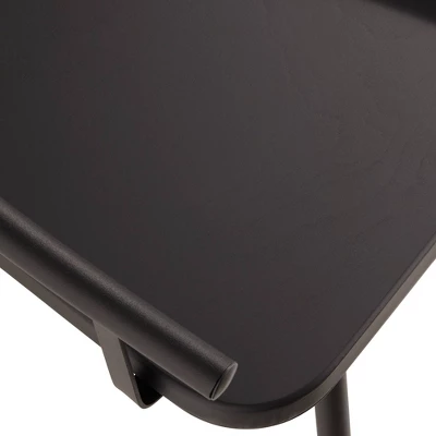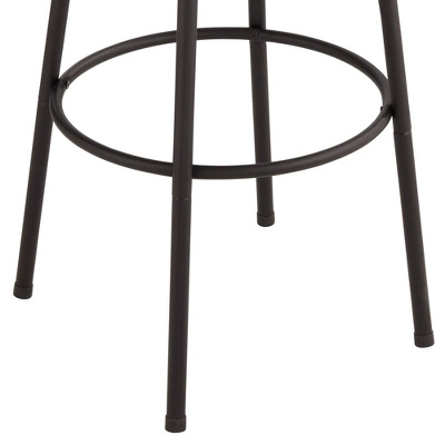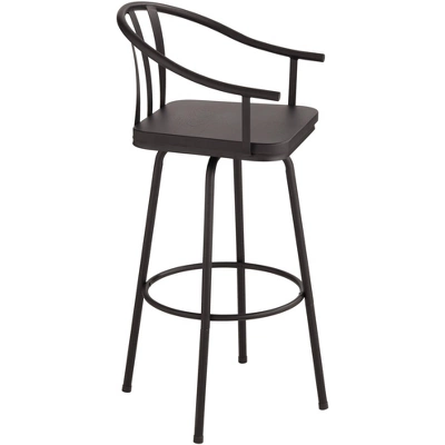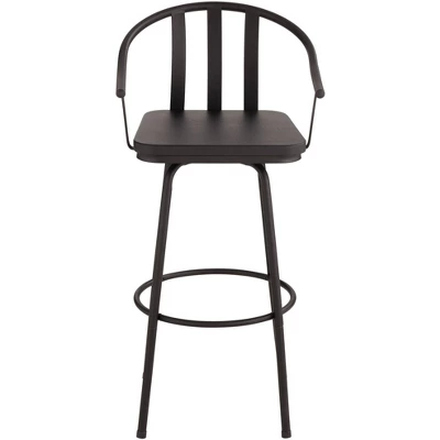 Simple monochromatic beauty exists within the Lael black metal and wood swivel barstool. From the Elm Lane brand, this stool is made from a blend of metal and MDF wood, all with a sleek black finish. The curved arms, back slates and round footrest complete this modern design.