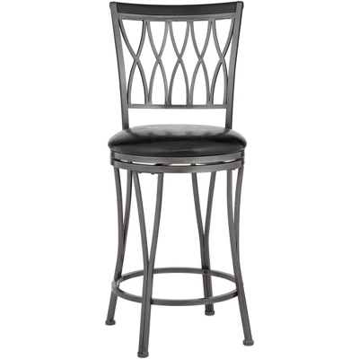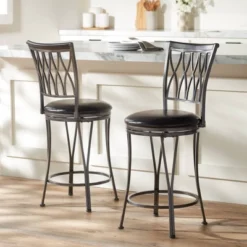 Simply modern beauty makes up the Dominick metal swivel counterstools set of two from the Elm Lane brand. Each stool features a black solid poplar wood backrest with a crisscrossing pattern. Round cushions provide a comfy place to sit while you swivel around or use the footrest at the bottom.