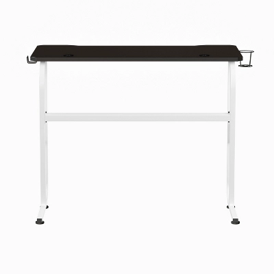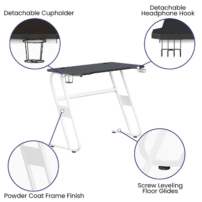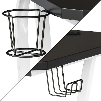 Add personality to your gaming setup with this ergonomic gaming desk with sleek white frame. For excitable players, this game station has a cup holder to prevent accidental spills. For those that game at home or are professional game testers in an office, gaming desks and chairs are essential for daily gamers. The multi-function workstation powers you through game sessions and work demands on a sturdy z-shape frame. Reduce clutter on the worksurface by feeding cords through the two provided grommets. Always know where your headset is by placing on the headset hook in between games. Upgrade the gamer or salesman in your home or office with this computer gaming desk. Complete your gaming setup with our Gaming Chair Racing Office Ergonomic Computer PC Chairs.