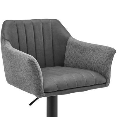 The Armen Living Erin Gray Faux Leather and Metal Adjustable Swivel Bar Stool is the perfect combination of luxury and convenience. The seat provides full support with a full back and arms, allowing optimal comfort for hours on end. The adjustable feature provides so much convenience and you can raise or lower to your desired height. The soft Gray faux leather and fabric upholstery and black metal base give your home a modern touch. Never miss out on the conversation regardless of your position in the room, the Erin stool has full swivel functionality that provides optimal mobility. The Armen Living Erin Faux Leather and Metal Adjustable Bar Stool comes in beautiful Gray faux leather and fabric upholstery and a cool black metal finish base.