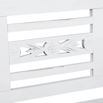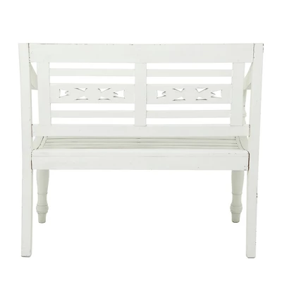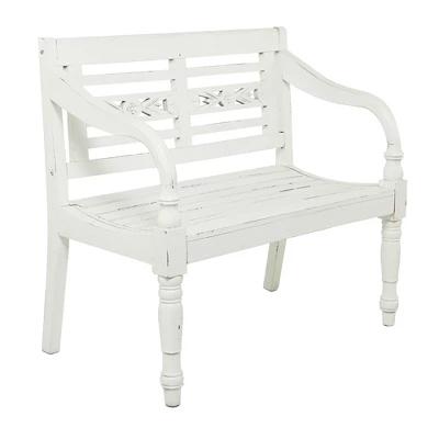 So take a load off and relax on this decorative bench. A small piece of furniture that make a big difference to give your home an instance refresh. White farmhouse bench carries a blend of style and function and will complement light colored pillows and natural grass baskets. This item ships in 1 carton. Suitable for indoor use only. Some assembly required. Maximum weight limit is 400 lbs. Made in Indonesia. Can accommodate 2 people. This is a single white colored entryway bench. Farmhouse style.