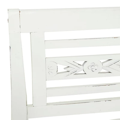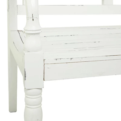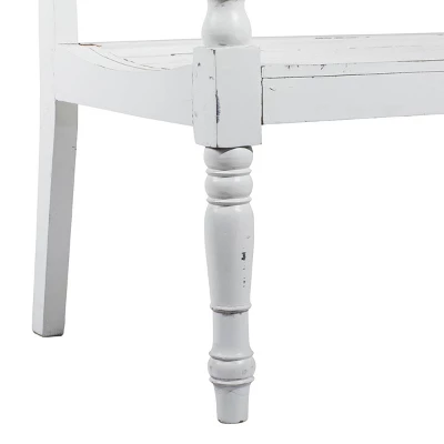 - •Farmhouse wood bench highlights an alabaster white overall finish with dark distressing