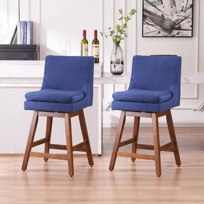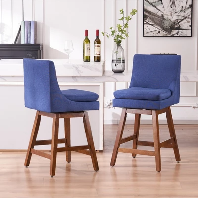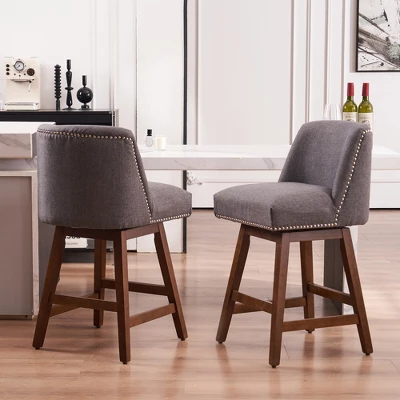 Elegant and functional 2 pack swivel bar stools, designed to elevate your home bar or kitchen counter with style and comfort. Available in two sophisticated colors, navy and gray, these bar stools are the perfect addition to any modern or traditional decor. Crafted with quality in mind, these bar stools feature a sturdy wooden frame that provides durability and stability for long-lasting use. The wooden frame is beautifully finished to complement the overall aesthetic of the stools. The comfortable seat is upholstered in a high-quality fabric, offering a cozy seating experience. With a seat height of 26 inches, these bar stools are designed to perfectly match standard bar counters. The swivel feature allows for easy movement and interaction, while the supportive backrest adds extra comfort for extended sitting. You have the option to choose between two styles: with Rivet Trim and classic design without Rivet Trim. The Rivet Trim style adds a touch of sophistication and elegance, while the classic style without Rivet Trim offers a clean and minimalistic look. Select the style that best suits your personal taste and the overall ambiance of your space. Assembly is required for these bar stools, but worry not! The package includes all the necessary tools and clear instructions to make the assembly process hassle-free and quick.Upgrade your home counter, kitchen island or home office with our 2 pack swivel bar stools, combining style, comfort, and functionality. Widely use bar stools also available for bar couner and restaurant. Create a welcoming atmosphere for your family and guests to enjoy meals, drinks, and conversations in utmost relaxation and elegance.