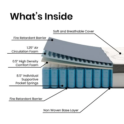 Prepare yourself for the best sleep ever on this widely popular traditional mattress that properly supports your body. Designed to provide the restful sleep you and your family need, this hybrid mattress is constructed with ultra-supportive material that conforms to your shape as you sleep. The foam is CertiPUR-US Certified so it’s free from heavy metals, phthalates, BPDE, formaldehyde and has reduced VOCs so you can rest easy knowing your indoor air quality won’t be compromised. No matter your sleep position, you will fall in love with this 10 inch pressure relief mattress with smaller springs that provide less bounce to comfortably cradle your body while at rest. Our full mattress has the firmness you need with the softness you crave and features individually wrapped pocket spring coils that reduce motion transfer to help you stay asleep while minimizing pressure points and back pain. Finding a comfortable mattress can be tough, but we’ve got your back and front with this amazingly comfortable hybrid mattress. This full-size mattress is compatible with trundle beds, platform beds and adjustable bed frames, when using with a standard bed frame a box spring or other foundation is required.