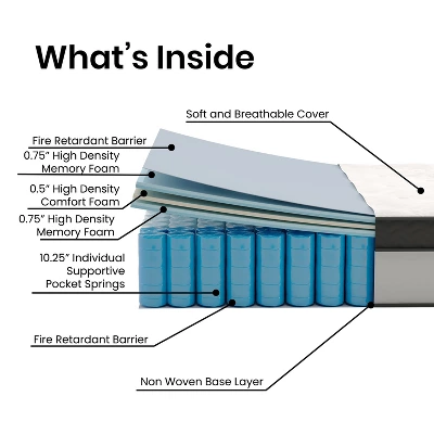 A great night’s sleep is essential to maintain both your physical and mental well-being so choosing the best full mattress is paramount. This hybrid full mattress, offering pocket spring support with the added benefit of luxurious memory foam layering, will give you the firmness you need with the softness you crave. The foam is CertiPUR-US Certified so it’s free from heavy metals, phthalates, BPDE, formaldehyde and has reduced VOCs so you can rest easy knowing your indoor air quality won’t be compromised. Extra cushioning on this full bed mattress cradles your body in every position, keeping your back, neck and shoulders more comfortable throughout the night while also being ultra-supportive to provide the restful sleep you and your family deserve. Say goodbye to morning joint stiffness and wakeful nights. Individually wrapped pocket spring coils reduce motion transfer to help you stay asleep while minimizing pressure points and back pain. This full-size memory foam mattress is compatible with trundle beds, platform beds and adjustable bed frames, when using with a standard bed frame a box spring or other foundation is required. Arriving fully compressed and boxed, this full bed in a box can be easily moved where you need it. The top-quality construction of this memory foam padded mattress ensures long-lasting use and its integrated handles make transportation effortless. Perfect for your first house or apartment, or converting your child to a “big kid” bed, this full size bed mattress achieves the ideal blend of comfort, support and durability that will definitely upgrade your sleeping experience.