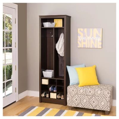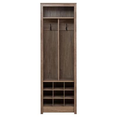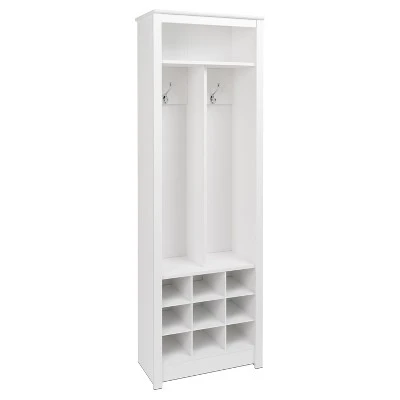 Customize your entryway, hallway or workspace with this versatile organizer. Fit one organizer in a narrow apartment hallway or combine multiple pieces in a large foyer to create a custom look at a fraction of the cost. This Entryway Organizer features two double coat hooks and one large upper shelf, which provides an ideal place to store jackets, hats, gloves, mail, car keys and any other entryway clutter. This unit also features 9 lower shoe cubbies that measure 7” W x 5.25” H X 11.75”D. This product is proudly manufactured in Canada using CARB-compliant, laminated composite wood. Ships ready-to-assemble, includes an instruction booklet for easy assembly and has a 5-year manufacturer’s limited warranty.