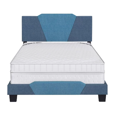 Bold block colors accentuate the unique diamond-shaped headboard and matching footboard of this upholstered bed frame. Bed is completely upholstered in linen and lightly padded for a premium look and feel. Base uses a quad cross-slat system and heavy-duty construction, that supports up to 700 lbs. A box spring or foundation is required with this base. Assembles in under 15 minutes. All hardware is included, conveniently zipped up in the back of the headboard. Entire bed ships in 1 box for easy transport. Limited 1 Year Warranty.