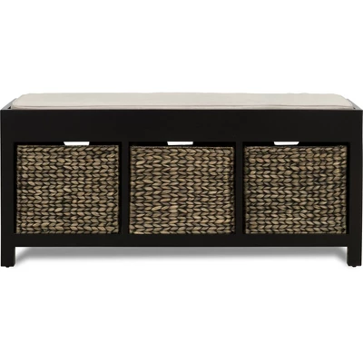 Create a stylish and functional accent to your living or family room with this convenient and comfy storage bench. The traditional design is well-suited to a white range of decor schemes. Try its evocative dark finish for a rich and distinguished look. The attractive wicker storage baskets are a practical low-maintenance option. The simple block feet work well in most design schemes.