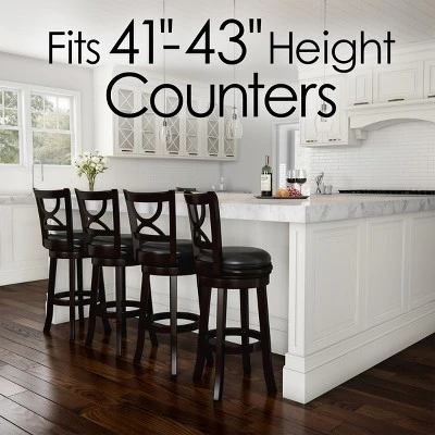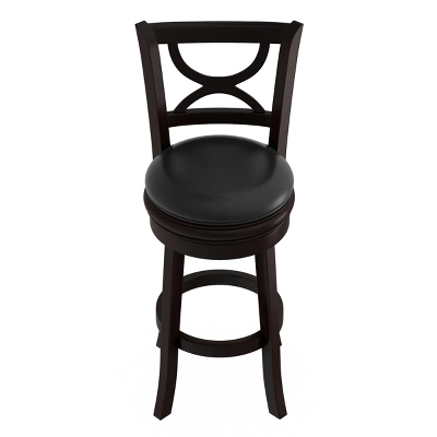Sit in style at your kitchen island, countertop, or pub table with this Swivel Bar Counter Stool by Hastings Home. This wood barstool features a 29″ high seat covered in cushy vinyl that is equipped with a 360-degree swivel, a curved chair back with an X-design, and tapered legs with a lower foot ring that serves as a convenient spot to rest your legs. With a sleek ebony wood finish and a black vinyl seat, this stool blends well with earth-tone color schemes and contrasts nicely with lighter colors too.