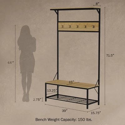 Create additional storage space in your entryway or mudroom with this attractive and durable Hastings Home Entryway Storage Bench. This freestanding piece of furniture features a bench for you to comfortably sit and take off your shoes for storing on the wire rack underneath. A large upper shelf allows you to display hats or other items, while the rustic organizer’s five metal coat hooks provide enough space for neatly hanging your jackets, scarves, umbrellas, or handbags.