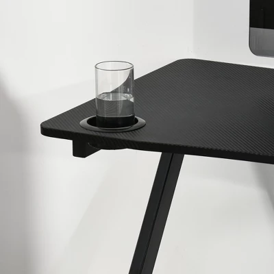 Attention to detail wins games, and trust that this ergonomic gaming desk is built to win. Our HOMCOM Computer Desk features a large monitor surface for placing all of your hardware. This office desk features built-in support for all your gaming hardware, providing solutions for your headphones, speakers, and drinks. This home desk table can seamlessly take you from workstation to a battle station.