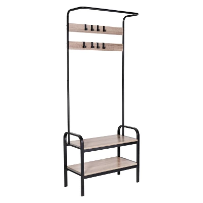 This sophisticated entryway organizer includes two levels of coat hooks to hold hats, jackets, keys or coats. The mdf shelves hold several pairs of shoes, or accessorize with small baskets for gloves or a dog leash. The top shelf/bench is great for setting bags, purses, backpacks and more as you walk in the door.