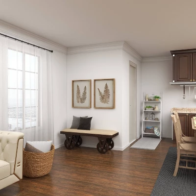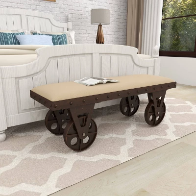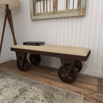 So take a load off and relax on this decorative bench. A small piece of furniture that make a big difference to give your home an instance refresh. Rectangular upholstered bench will complement light colored sofa with other natural wood decor for the perfect rustic look. This item ships in 1 carton. Full metal frame comes with functional wheels for smooth movement. Suitable for indoor use only. Some assembly required. Maximum weight limit is 400 lbs. Can accommodate 2 people. This is a single brown colored entryway bench. Industrial style.