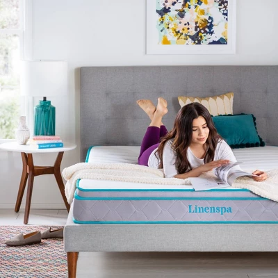Add the pressure point relief of memory foam to the reliable support of a traditional spring mattress, and you have the revolutionary comfort of the Linenspa Essentials 8″ Hybrid Mattress. A layer of memory foam is quilted in the soft, knit cover and placed over a 1.5 inch layer of comfort foam to create an incredibly comfortable sleep surface. The foam conforms to the unique curves of your body to minimize pressure points. Beneath the foam top, 6-inch steel coils offer the support and durability of a spring mattress. This design distributes body weight to contour and support as you sleep. The spring layer provides the traditional bounce many like in an innerspring mattress, and improves the breathability of the mattress. This mattress is rolled and shipped in a box for convenient delivery and setup. Simply take the box to the proper room, carefully remove packaging, and watch as the mattress expands to its true size. This mattress comes with a 10-year U.S. warranty that guards against manufacturer defect.