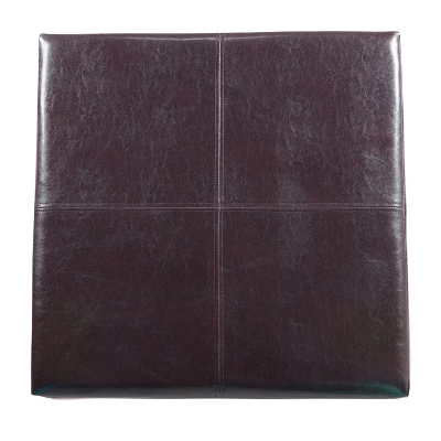 This large faux leather storage ottoman offers an easy and stylish storage solution for pillows, blankets, books or toys. The rich leather-like upholstery on this square ottoman makes it suitable as a coffee table in a living room or family room, or as extra seating in a study. The hinged lid allows easy access to items nearby but out of view. With stitching details for added interest and tapered wood legs in a rosewood finish, this large storage ottoman offers a stylish storage and seating solution for years to come. Easy to assemble and maintain.