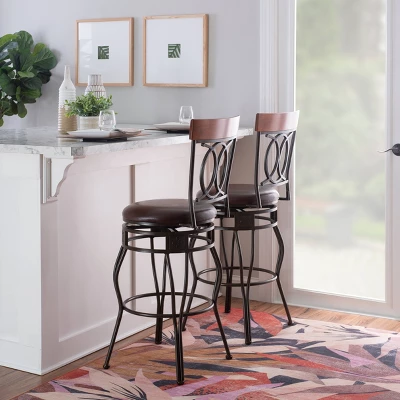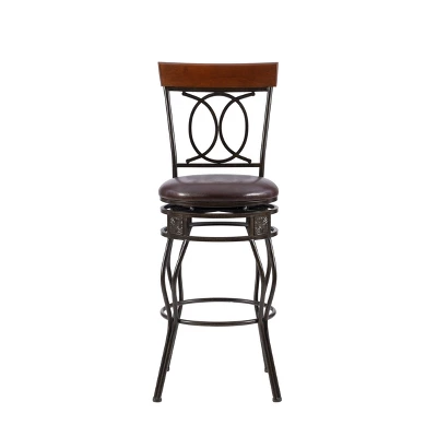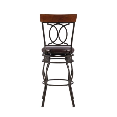 The elegance and unique style of this 30″ O&X Back Bar Stool will carry throughout your kitchen, dining, or home pub area. Crafted of metal and highlighted with subtle curves and a distinctive O & X back, this stool is a positively striking addition to your home. The cushion is piled high for extra comfort, and the chocolate wipe clean vinyl seat is pliable and resistant to everyday wear and tear, making this stool versatile for any gathering area. 275-pound weight limit.