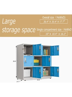 Introducing the MECOLOR 35.4 in. Multipurpose Locker Metal 9 Door Storage Cabinet Room Organizer with Lock, the ultimate solution for keeping your belongings safe, organized, and easily accessible. This modern and stylish storage cabinet is perfect for decluttering and organizing toys, clothes, shoes, bags, backpacks, and much more, making it an ideal choice for use in your home, schools, daycares, and gyms. The storage cabinet features 9 individual cubby holes, each with dimensions of 16.3 x 10.4 x 10 in. These spacious compartments provide ample storage space for various items, allowing you to keep everything in its proper place, whether you’re organizing classroom supplies, gym equipment, or personal belongings. Constructed from high-quality metal, this storage cabinet is designed for durability and longevity. The robust material can easily withstand daily wear and tear, making it a long-lasting addition to your home, office, or any space in need of organization. Each of the 9 compartments comes with a lock and key, allowing you to secure your items with confidence. The locks provide an extra layer of protection for your belongings, giving you peace of mind knowing that your valuables are safe. This feature is particularly beneficial in shared spaces like schools, daycares, and gyms, where multiple users can securely store their items without worry. The MECOLOR Multipurpose Locker Metal Storage Cabinet is not only functional but also stylish. Its sleek design and clean lines make it a perfect fit for any room, seamlessly blending in with various interior styles. Whether you choose to use it in a classroom, daycare center, gym locker room, or staff break area, this utility organizer will enhance your space while providing much-needed storage solutions. Upgrade your organization game with the MECOLOR 35.4 in. Multipurpose Locker Metal 9 Door Storage Cabinet Room Organizer with Lock. Keep your clutter at bay and enjoy a more organized and efficient space in your home, school, daycare, or gym today.