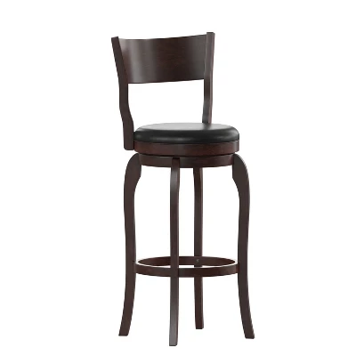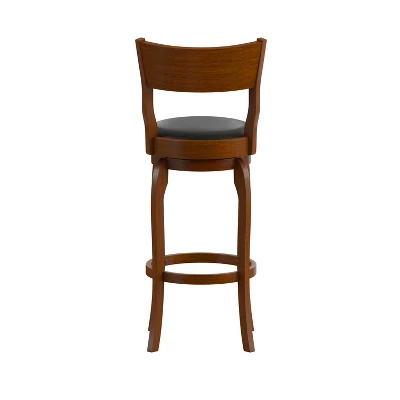 Old world charm abounds in this classic style bar height stool ideal for your kitchen island, dining room, or as extra seating. The richly hued wood grain look, available in 2 finishes, creates a warm, inviting ambiance ideal for any living space. Constructed of solid wood, boasting 360° swivel, and an integrated footrest for additional comfort, this chair provides a comfortable and stable seating experience.