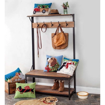Bring style to your storage with our Deep Creek Coat Rack, a functional piece designed to save space and store plenty. All wood surfaces are reclaimed and rustic for a great look. The black wrought iron frame is solid, sturdy and stunning with legs that are nicely turned for an elegant look. Super-functional design features five double hooks, top storage shelf, generous seating area, plus a bottom shelf perfect for shoe and boot storage. You’ll love the versatility, function and size of this attractive piece. Industrial-chic aesthetic blends well with farmhouse, classic or transitional styles. Easy assembly.