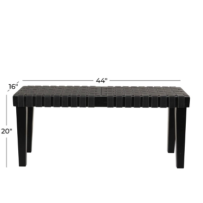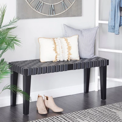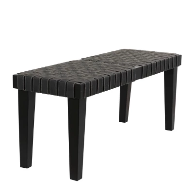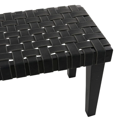 - â¢This black faux leather bench features a rectangular wooden base with an intricately woven faux leather belt seat and four sturdy birch tree legs