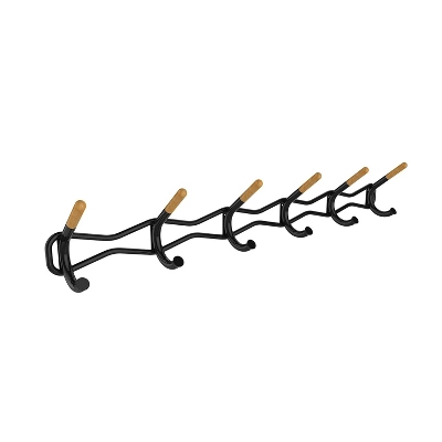 The wall mounted 6 hook family coat racks for storage and organization. Family coat rack. Steel construction with black powder coat finish. 7.25″”H x 42.75″”W x 5.25″”D. 6 wood tip garment hooks. Rounded edges to help protect garments from snagging. Wooden tip for a subtly stylish flair. Great for use in private offices, coat rooms and a variety of areas. Sold as 1 Each.