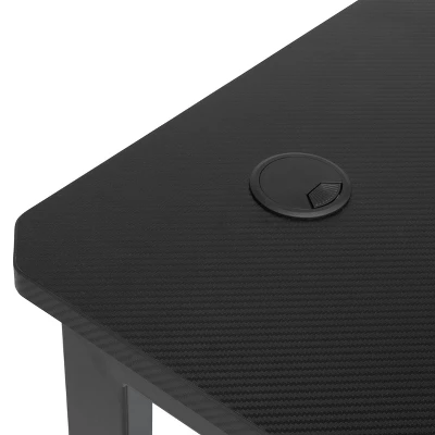 - Desktop Features: Dimensions-43.25″ Wide x 23.5″ Deep, Simulated Carbon Fiber Finish, Two Cable Management Holes with Plastic Covers: 2″ Wide