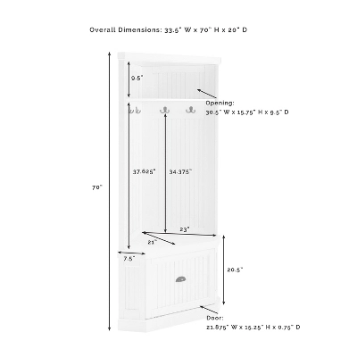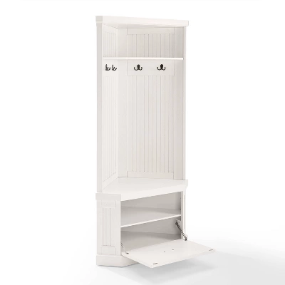 Whether your decor style is coastal cottage or traditional, the Seaside Corner Hall Tree is a great addition to any entryway or mudroom. Simple molding and beadboard paneling form a classic coastal look, while four metal hooks create functional hanging space for coats, scarves and hats. The base of the hall tree features a storage compartment with hinged door and removable shelf, perfect for shoes and other items you want out of sight. With its slim corner hugging design and variety of storage options, the Seaside Corner Hall Tree helps you stay organized without overwhelming your living space.
