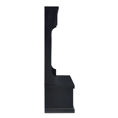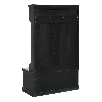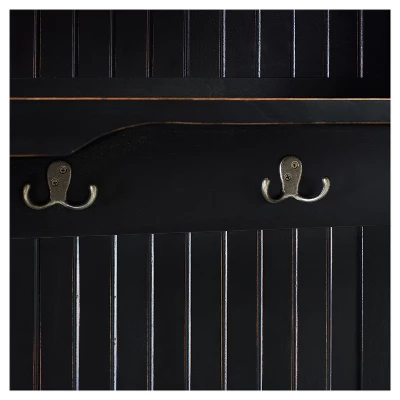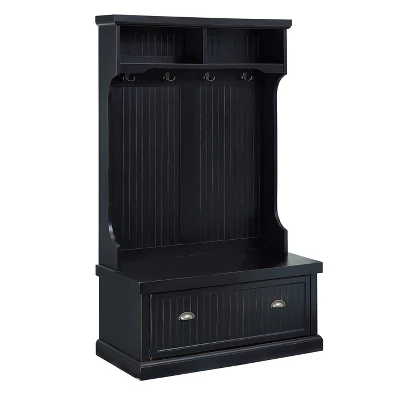 Capture the feeling of an effortless beach home with the Seaside Hall Tree from Crosley. Have a seat on the full-sized bench seat, perfect for getting ready for the day. Constructed from solid hardwood and veneers, the weathered surface softens the classical lines and suits any home. Pull the drop-down drawers forward with genuine metal hardware and find two spacious cubbies inside, perfect for storing shoes, scarves, and other clutter best kept out of sight. The tall, slatted back is equipped with hooks for hanging coats out of the way, and two more overhead cubbies offer space for decor or storage.