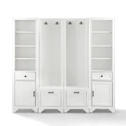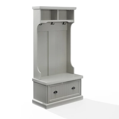 Classic beadboard details elevate the simple design of the Shoreline Hall Tree. Sized conservatively to fit in smaller entryways, this hall tree offers bench seating with a large drawer perfect for tucking away shoes. The three double prong hooks provide hanging storage for coats and book bags, while the two open shelves at the top can hold smaller items like your wallet and keys. Keep your home’s entrance clutter-free with the Shoreline Hall Tree.