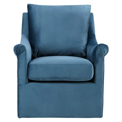 The curved arms and straight back of the Sparta Swivel Chair adds a touch of glamour to any space. A high-density foam filling and solid wood frame provide exceptional comfort and support, while the swivel feature allows the lounge chair to rotate on its base. Upholstered in a velvet fabric, this swivel chair will make an eye-catching piece in your home. No assembly required.