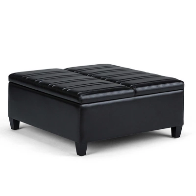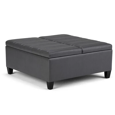 Tyler 36 inch Wide Contemporary Square Storage Ottoman. Comes with child safety hinge to prevent lid slamming. Vertical stitching detail. Available in Tanners Brown, Chocolate Brown, Midnight Black, Satin Cream, Crimson Red faux leather or Stone gray, Slate gray, Dove gray, Fawn Brown linen look fabric. Simple assembly; just attach legs. Efforts are made to reproduce accurate colors, variations in color may occur due to computer monitor and photography. The product is warranted to be free from defects in material and workmanship to the original owner for the life of the product (conditions apply).