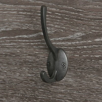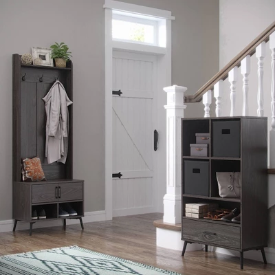 Beautiful hall tree with neutral woodgrain pattern makes a bold statement in any entryway or mudroom. Features a small shelf on top and three double coat hooks for hanging jackets, bags or hats. One horizontal shelf behind cabinet doors and two open cubby shelves below stow away entryway clutter. Spacious seat is perfect for sitting to tie your shoes, or top off with a decorative throw pillow to give guests a charming first impression. Mix and match with five, additional Woodbury Collection items to create your favorite entryway arrangement.